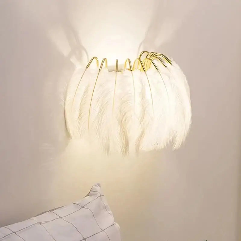 Aplique de plumas blancas con soporte dorado: una luminaria refinada que combina la suavidad de las plumas blancas con el brillo del soporte dorado.