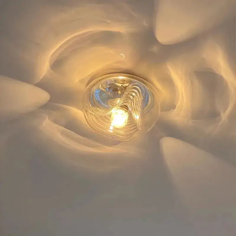 Aplique de pared transparente en cristal soplado a mano, difunde una luz suave y elegante, realzando cada espacio con refinamiento.