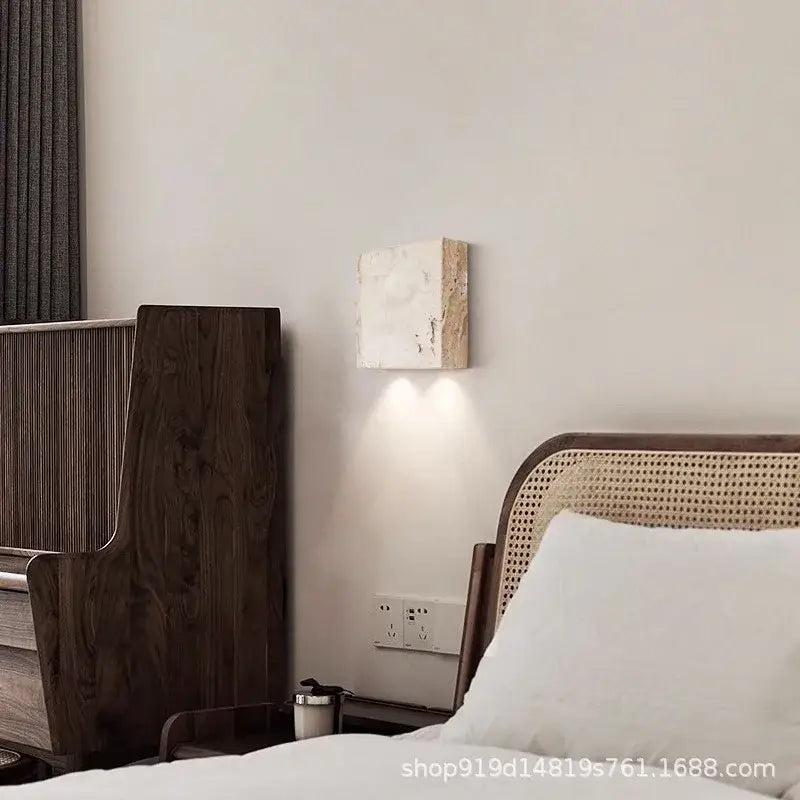 Aplique de pared cuadrado en piedra efecto travertino natural, diseño mineral moderno y luz suave para realzar salón, dormitorio o entrada.