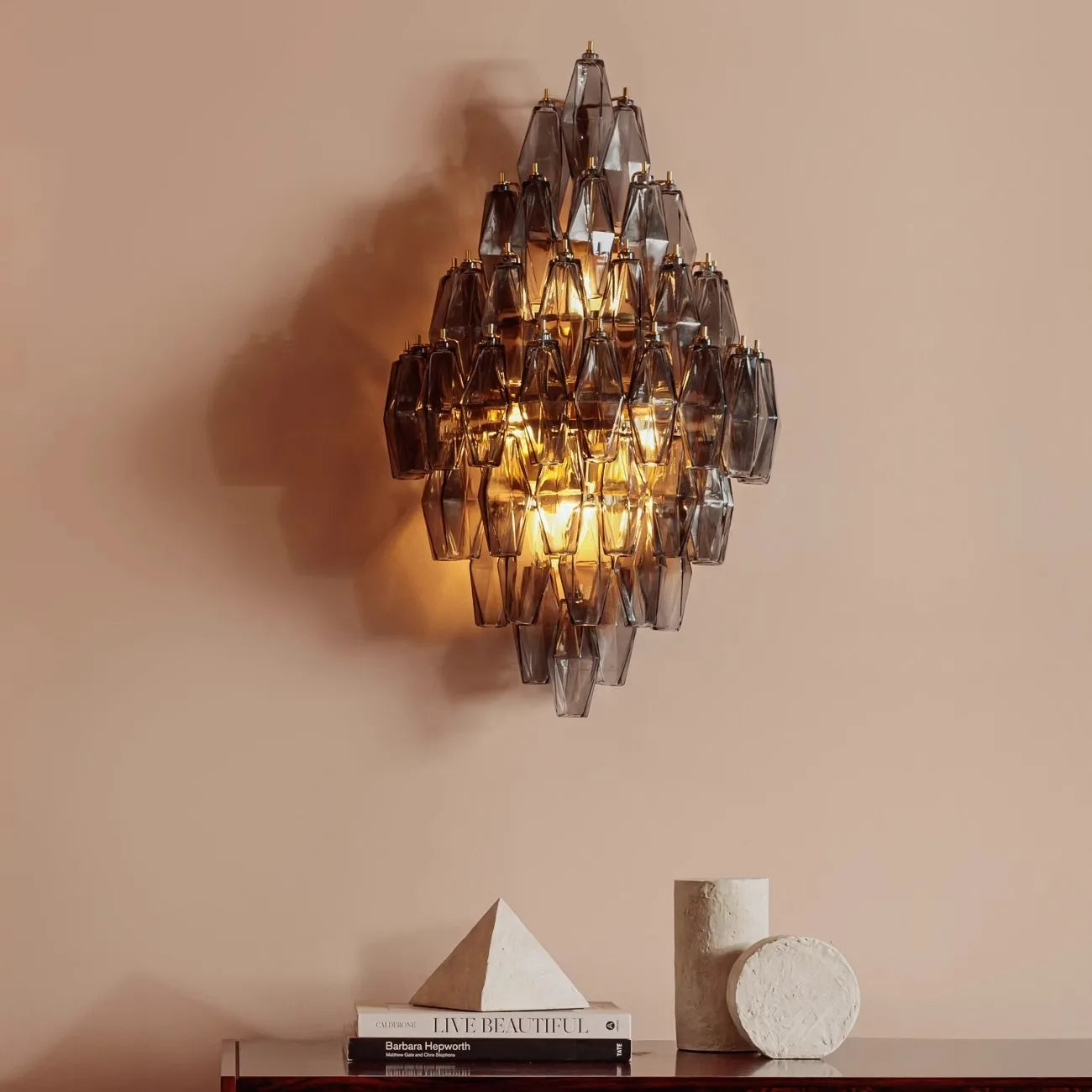 El aplique de pared de cristal gris ahumado de estilo Art Decó realza tus paredes con elegancia y calidez, combinando una luz suave y un diseño refinado.