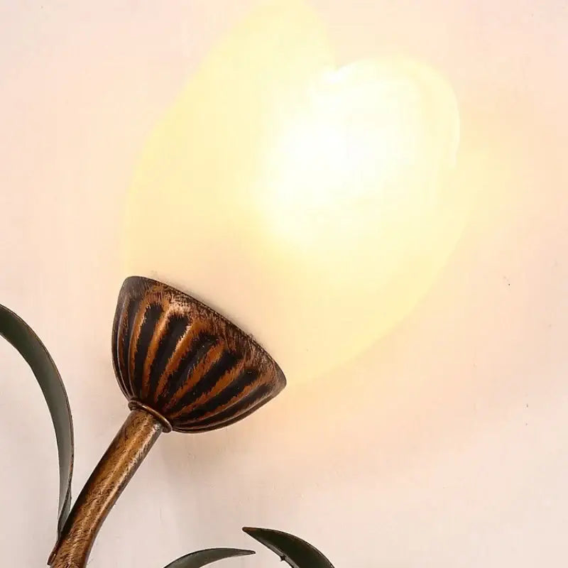 Aplique de pared floral dorado con globo de cristal blanco, una elegante luminaria que difunde una luz suave y realza tus paredes con refinamiento.