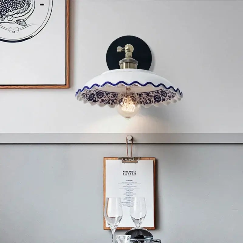 Applique vintage en céramique blanche et motif bleu apporte charme artisanal et lumière douce pour créer une ambiance chaleureuse et élégante dans votre intérieur.