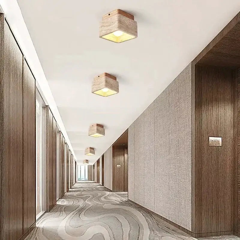 Esta lámpara de techo cúbica de estilo minimalista con efecto piedra natural prioriza la estética auténtica sobre la sofisticación. Es una opción decorativa que interactúa con los materiales existentes sin competir con ellos, reforzando una sensación minimalista y cálida.