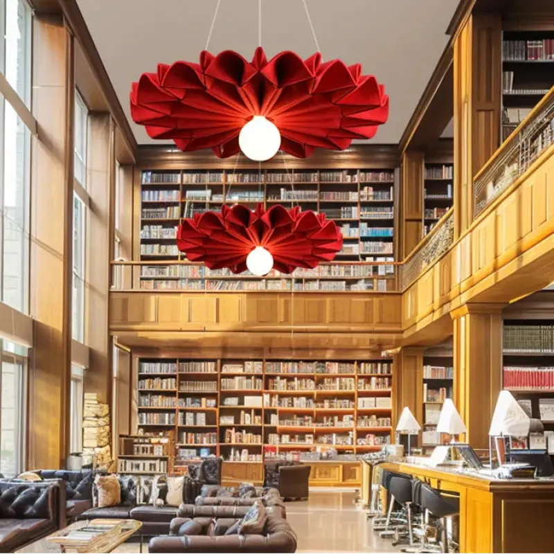 Ya sea en una sala de estar, un comedor, un dormitorio, una oficina o un espacio colaborativo, la lámpara colgante acústica antiruido con forma de flor PET se combina con muchos estilos de interiores.