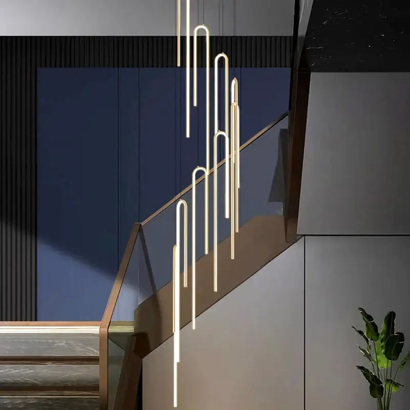 La moderna lámpara colgante cilíndrica dorada tipo cascada para techo alto destaca por su estilo refinado y su capacidad para transformar cualquier espacio en un lugar único. Con su estilo sobrio pero lujoso, atrae la atención sin ser excesiva, lo que la convierte en la opción ideal para quienes buscan una decoración elegante y equilibrada.
