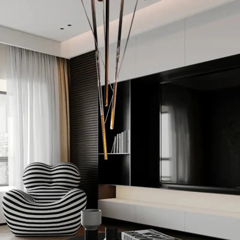 La lámpara colgante de diseño artístico con varillas de luz LED realza su interior con una luz artística cálida y una estética contemporánea única.