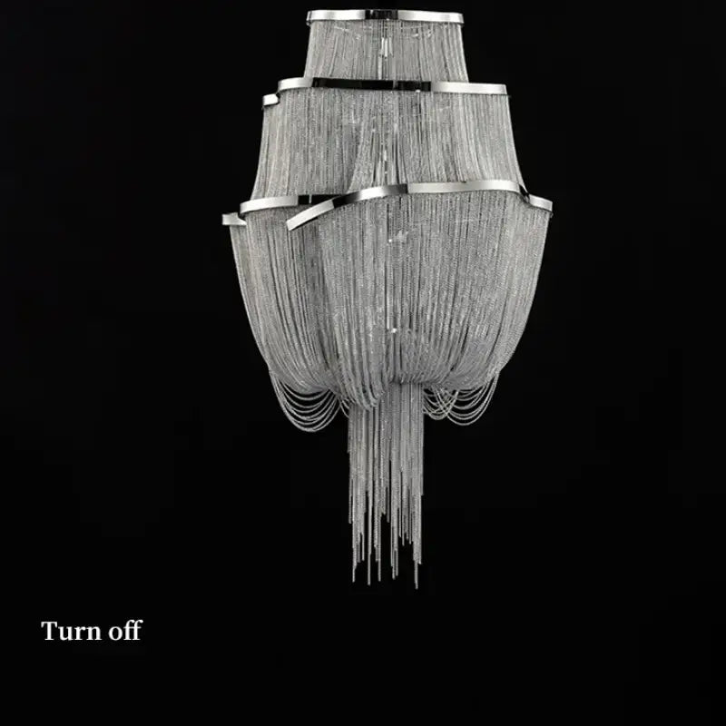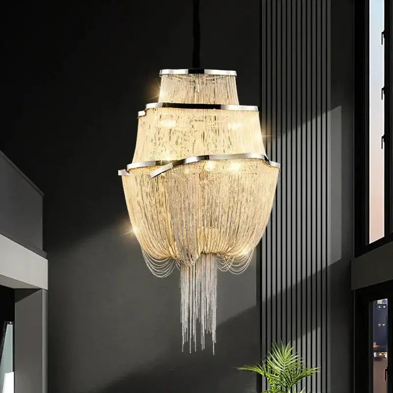 La elección de cadenas de oro aporta una dimensión artística y fluida, creando un ambiente luminoso que combina armoniosamente con interiores contemporáneos o clásicos.