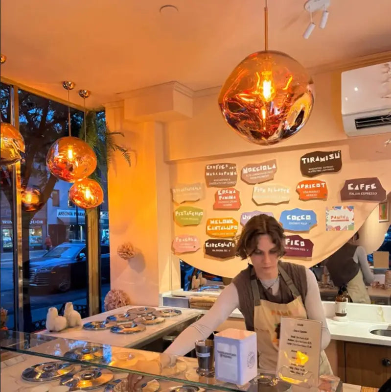 Esta moderna lámpara colgante de acrílico soplado en tonos dorados no solo ilumina tu espacio, sino que también se convierte en una pieza decorativa por sí misma. El tono dorado añade un toque de lujo sutil que realza cualquier estilo decorativo, ya sea minimalista o más elaborado.