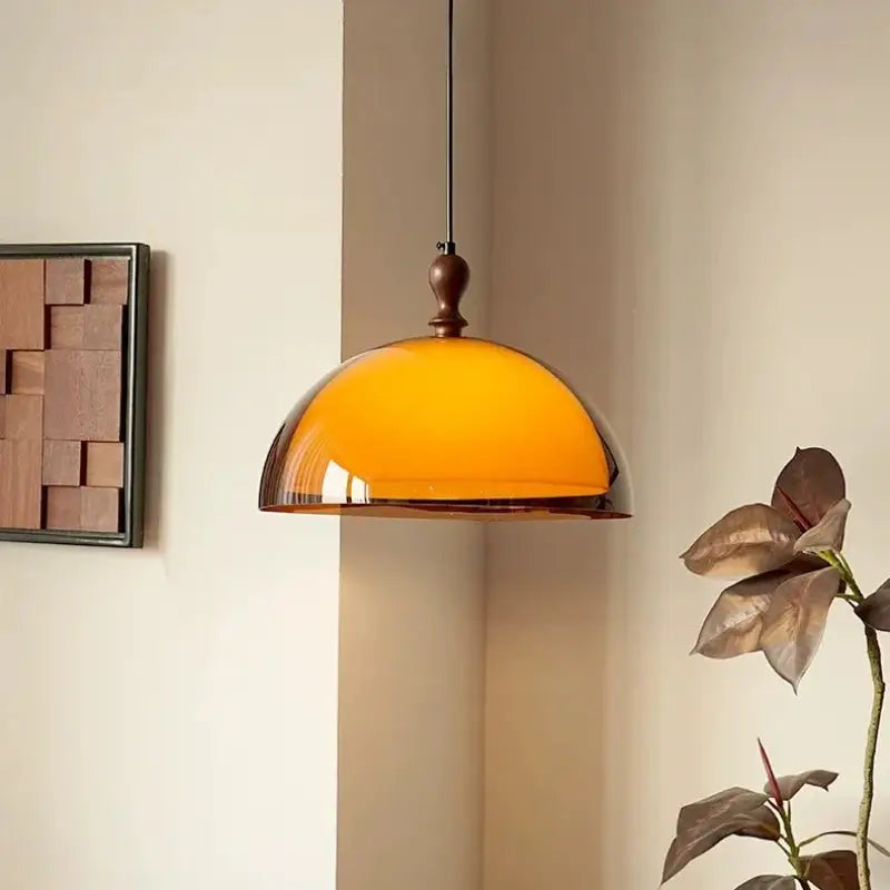 Lámpara colgante retro de cúpula de madera y naranja de estilo vintage