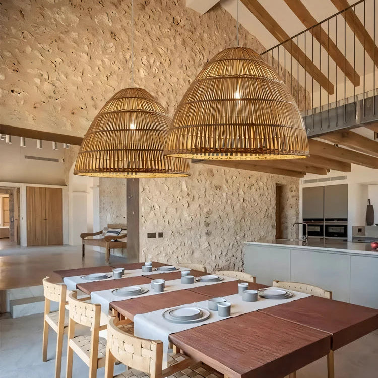 Un luminaire suspendu permet de structurer visuellement une pièce sans la surcharger. La suspension en bambou tressé design naturel bohème attire le regard vers le haut et apporte de la verticalité à l’espace. Dans une salle à manger, elle peut devenir le centre visuel de la pièce en créant une ambiance conviviale. Dans un salon, elle accompagne naturellement un mobilier aux lignes douces et aux matières naturelles. Ce type de suspension aide à définir les zones de vie tout en conservant une sensation de légèreté. Son design ajouré évite d’alourdir la décoration tout en ajoutant de la texture.