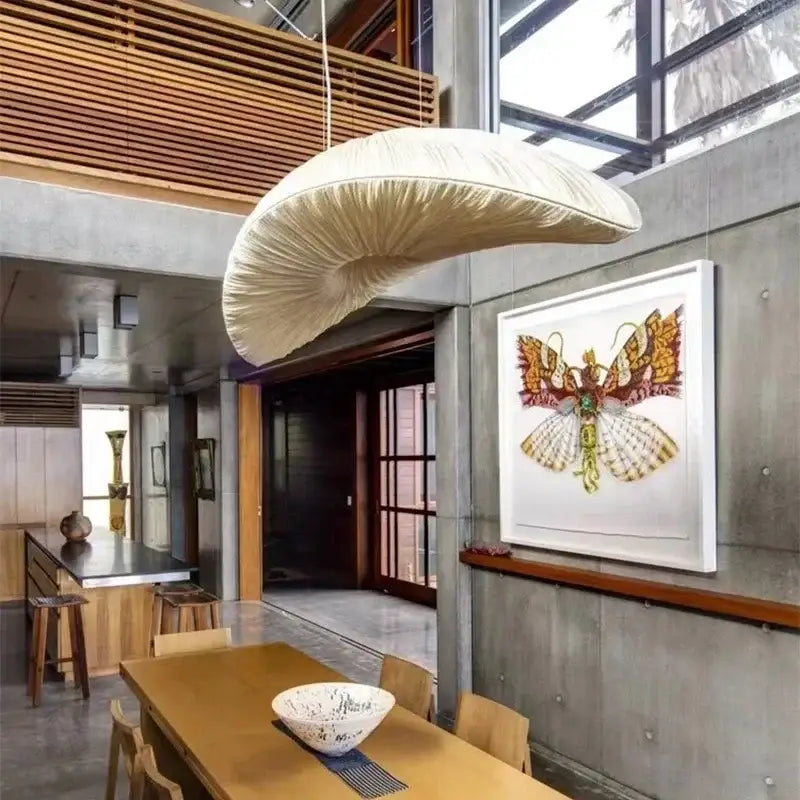 Lámpara colgante XXL Leaf de diseño moderno en fibras naturales que realza cualquier interior difundiendo una luz suave y un ambiente orgánico inspirado.
