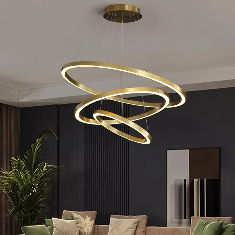 Lámpara colgante LED contemporánea dorada con elegantes anillos.