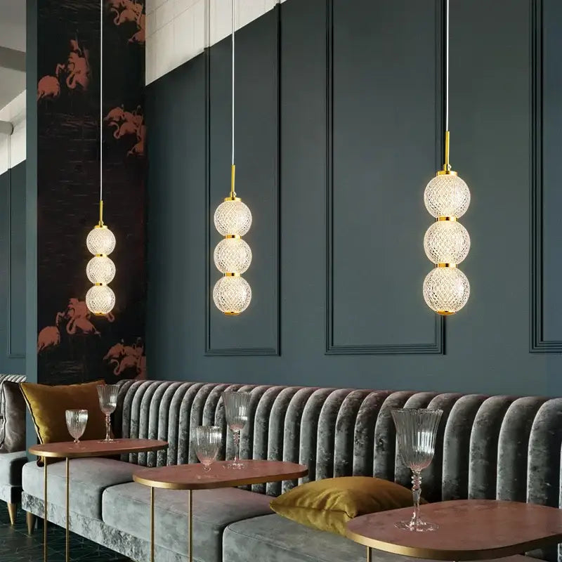 Lámpara colgante de diseño moderno con bolas de cristal, ideal para crear un ambiente elegante y cálido en cualquier tipo de interior moderno.