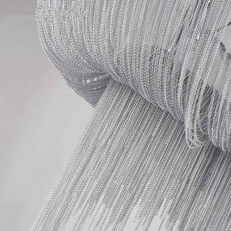 Una de las características clave de esta lámpara colgante es su original diseño, que combina modernidad y elegancia. Los cables metálicos plateados crean una textura cautivadora, similar a una cascada de luz, que atrae la mirada al entrar en la habitación. Esta lámpara es mucho más que una simple fuente de luz: es una auténtica obra de arte que añade un toque chic a su sala de estar, comedor o recibidor. Su forma delicada y líneas limpias la convierten en la opción perfecta para quienes buscan añadir carácter a su decoración interior.