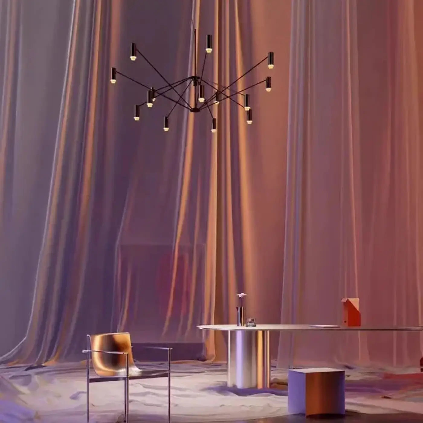 Colocada encima de una mesa o en el centro de un salón, actúa como una escultura luminosa. Sus brazos múltiples dibujan líneas en el espacio y aportan una dimensión gráfica a la decoración. La luz se convierte entonces en un elemento arquitectónico que dialoga con el mobiliario y los volúmenes de la habitación.