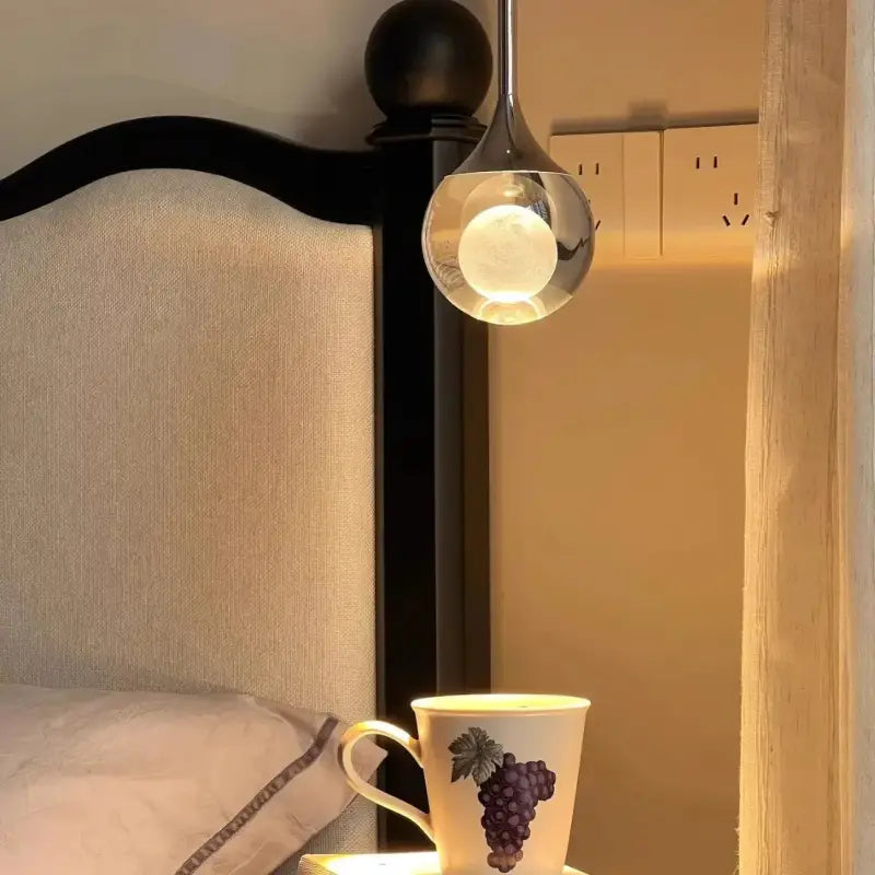 Lámpara colgante LED moderna con gota de cristal y elegante hierro forjado.
