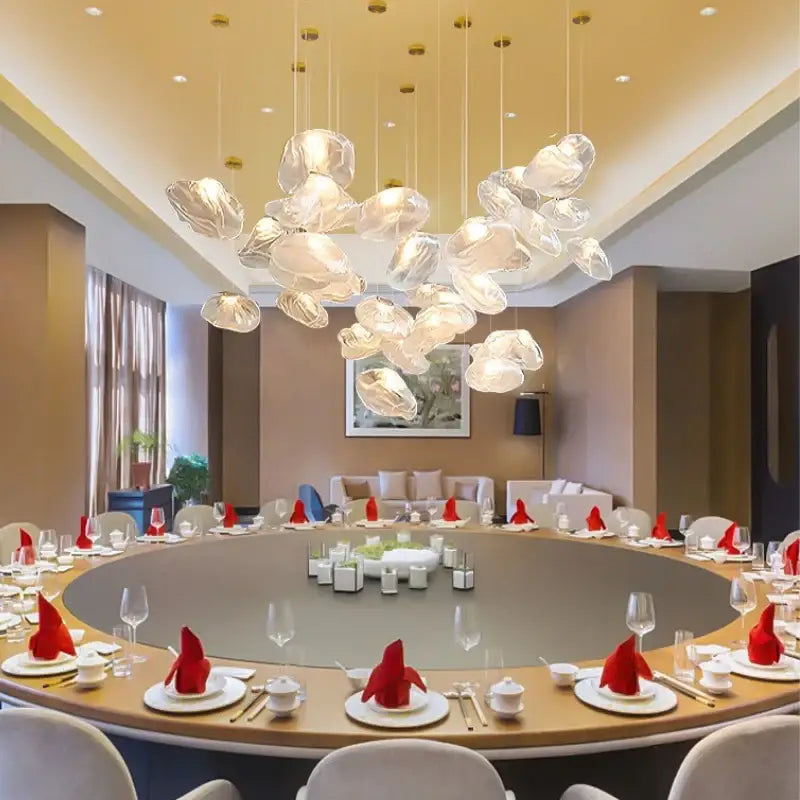 La lámpara colgante de nube con diseño escultural en vidrio transparente aporta una elegancia aireada y poética, una luz difusa y una atmósfera refinada.